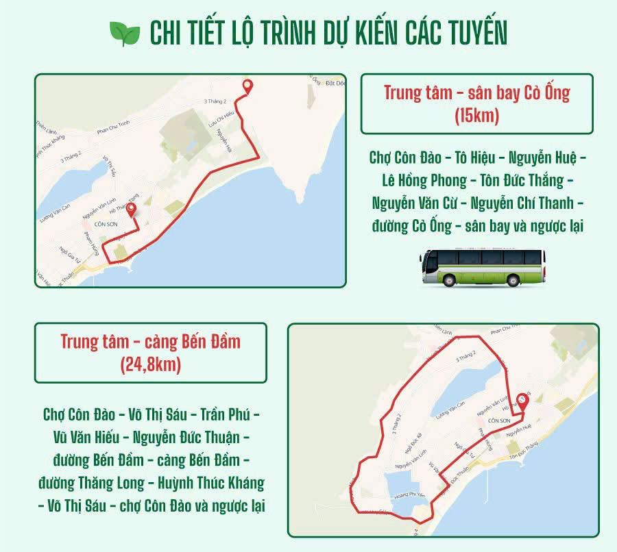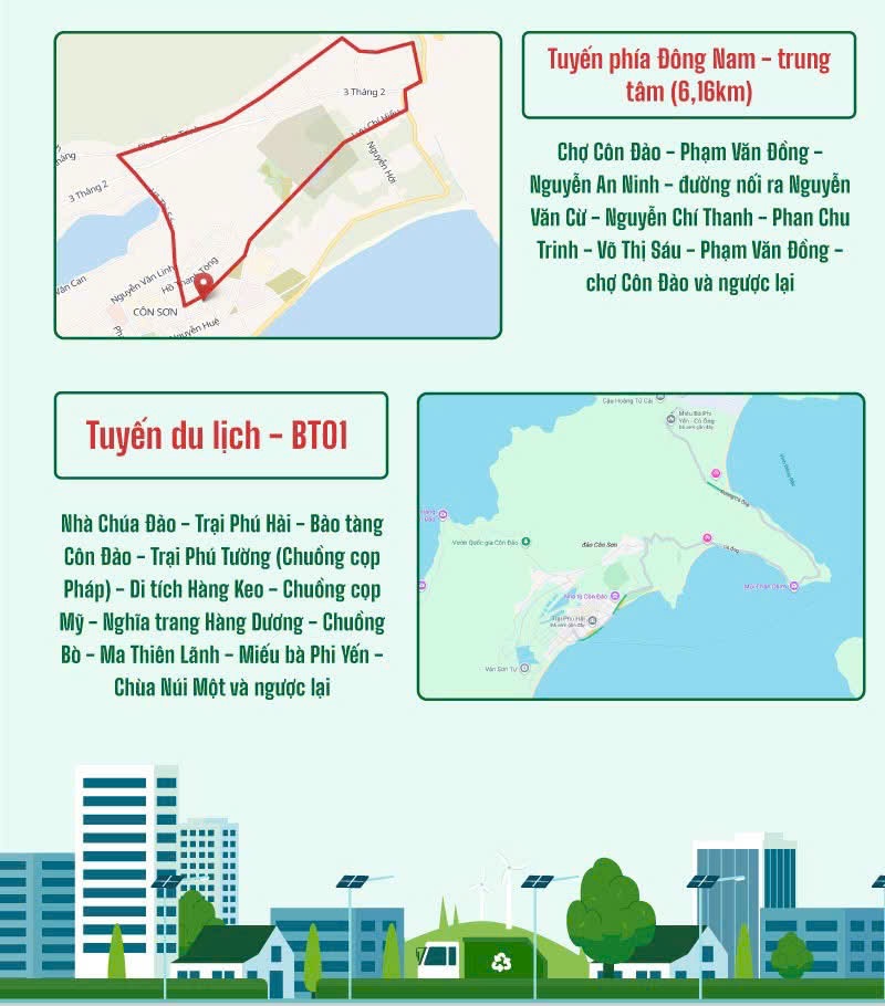 Hướng tới mục tiêu phát triển giao thông xanh và bền vững, Côn Đảo dự kiến sẽ triển khai 6 tuyến xe buýt điện kết nối giữa các điểm tham quan, trung tâm hành chính trên đảo và khu dân cư. Các tuyến xe buýt được đưa vào hoạt động không chỉ giúp hành khách thuận tiện khi đi lại, mà còn góp phần nâng cao hình ảnh du lịch Côn Đảo và bảo vệ môi trường.