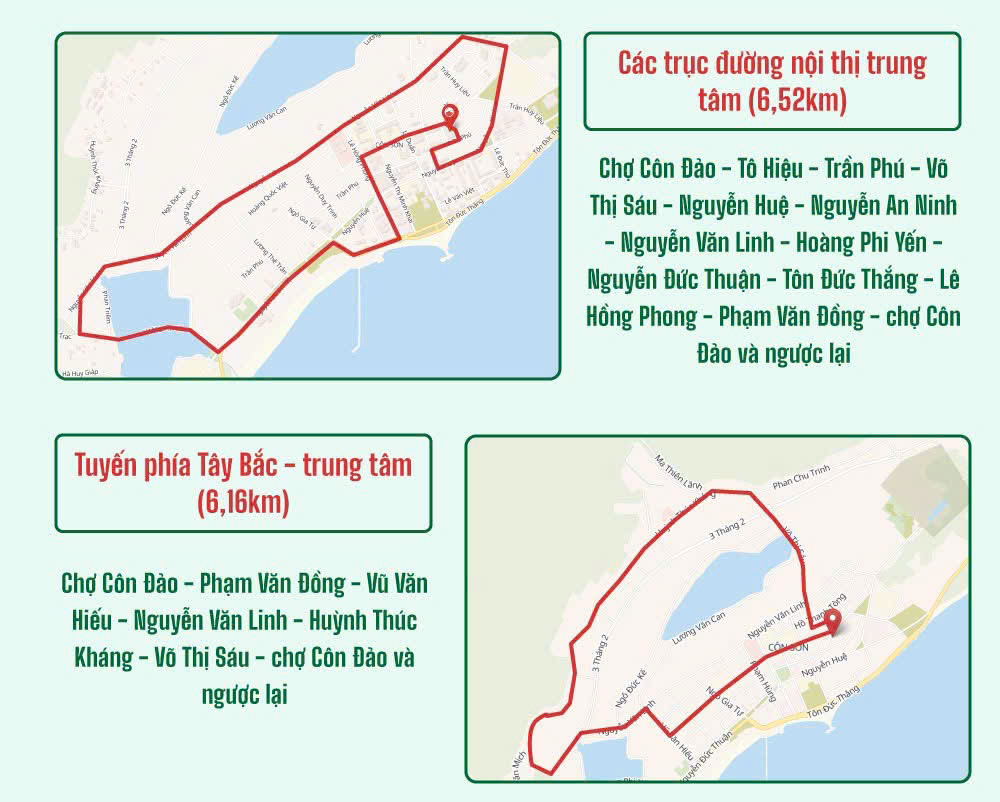 4. Tuyến phía Tây Bắc - trung tâm (6,16km): Chợ Côn Đảo - Phạm Văn Đồng - Vũ Văn Hiếu - Nguyễn Văn Linh - Huỳnh Thúc Kháng - Võ Thị Sáu - chợ Côn Đảo và ngược lại.
