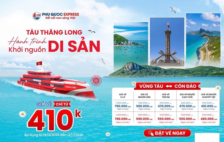Ngày 26/02/2026 (Mùng 10 Tết), siêu tàu Thăng Long thuộc Phú Quốc Express chính thức khai xuân tuyến Vũng Tàu - Côn Đảo, mở đầu mùa du xuân và hành hương đầu năm về vùng đất thiêng Côn Đảo trở lên thuận tiện, nhanh chóng và trọn vẹn hơn.